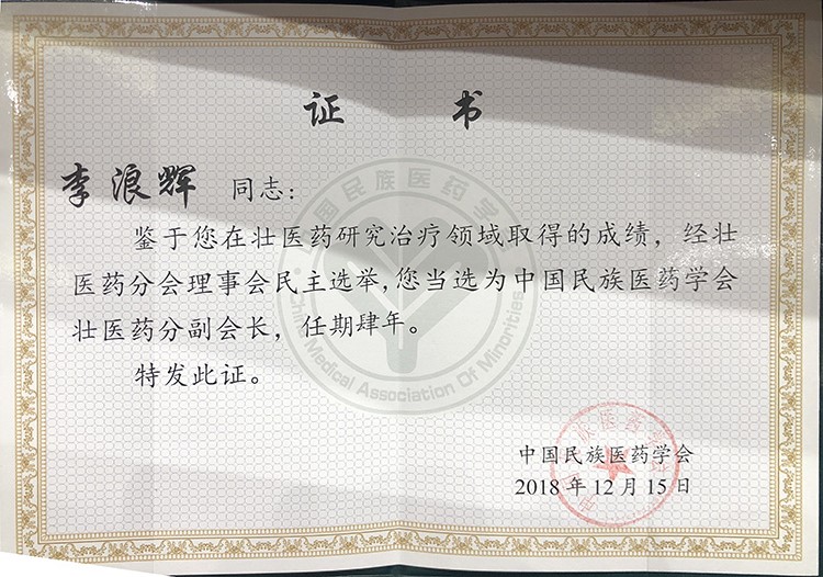 熱烈慶祝,12月15日,強壽集團董事長李浪輝因壯醫(yī)藥研究治療領(lǐng)域取得的成績,經(jīng)壯醫(yī)藥分會理事會民主選舉,當選為中國民族醫(yī)藥學會壯醫(yī)藥分會副會長!!!
