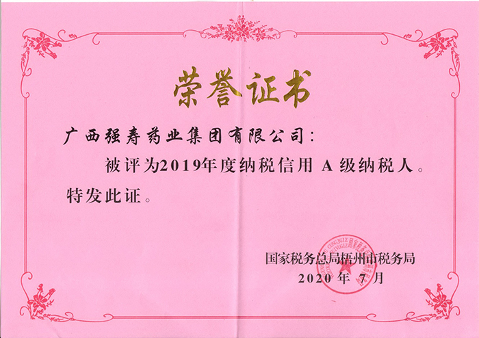 近日,國家稅務總局梧州市稅務局公布了2019年納稅信用評價工作情況,其中,廣西強壽藥業(yè)集團有限公司(簡稱“強壽集團”)憑借誠信納稅的良好信譽,被評為“2019年度納稅信用A級納稅人”,并喜獲《納稅信用A級榮譽證書》。